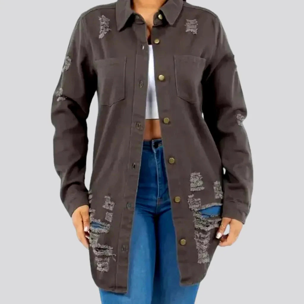 Introducing our stylish women's jean shirt, the ultimate blend of comfort and fashion, perfect for those chilly fall and winter days! This versatile piece features a classic button closure, ensuring you can layer it effortlessly over your favorite tops. Crafted from high-quality cotton denim, it offers a soft yet sturdy feel that will keep you cozy while keeping you on-trend. Its unique distressed pattern gives it a fashionable edge, making it an ideal addition to any grunge or street style wardrobe.