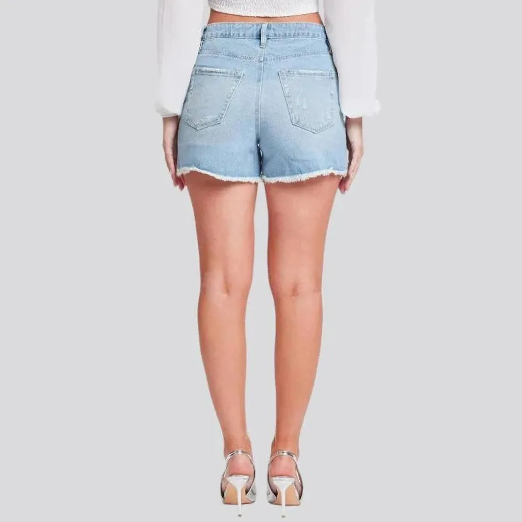 Introducing our distressed light-wash denim shorts from the 2024 Summer Collection the perfect embodiment of punkish style with a touch of elegance!
