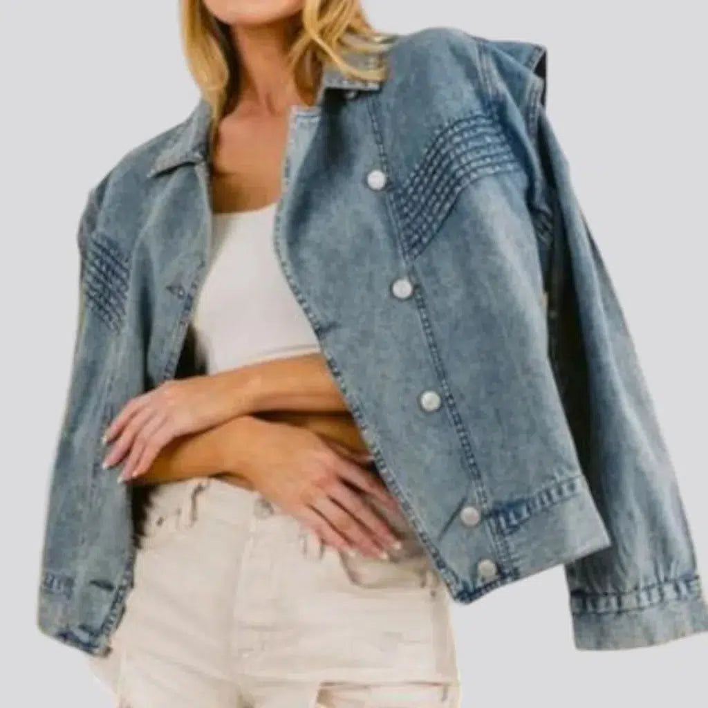 Take on the vogue world with confidence in our large jean jacket, a must-have from our 2024 Spring Collection. This vintage-inspired piece boasts layered shoulders and a v-neck for a touch of retro charm, while the no-stretch fabric and buttoned closure provide a modern twist.