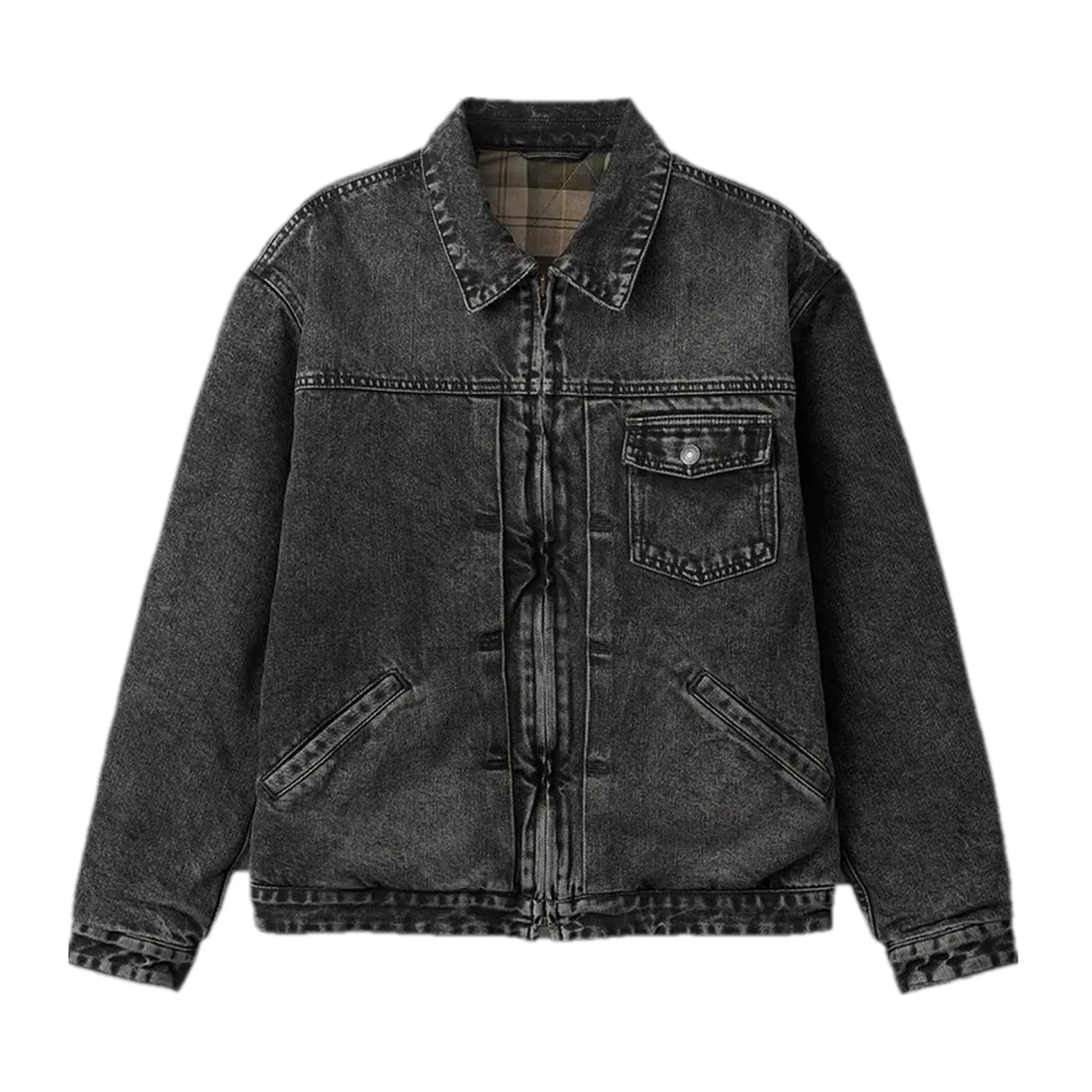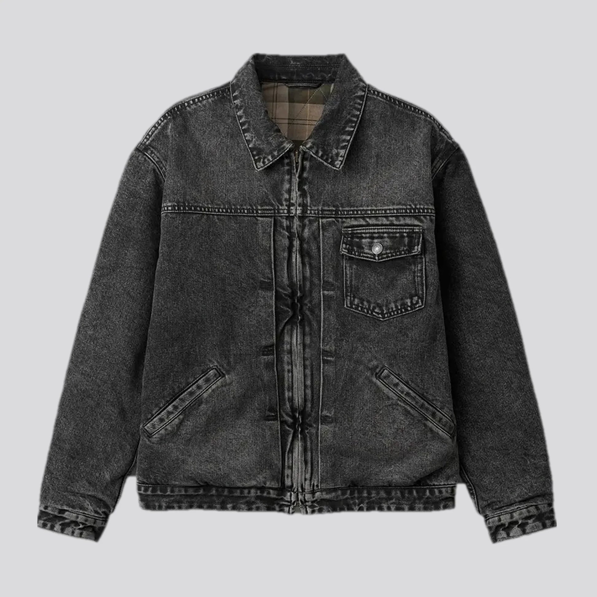 Stonewashed plaid men's jean jacket